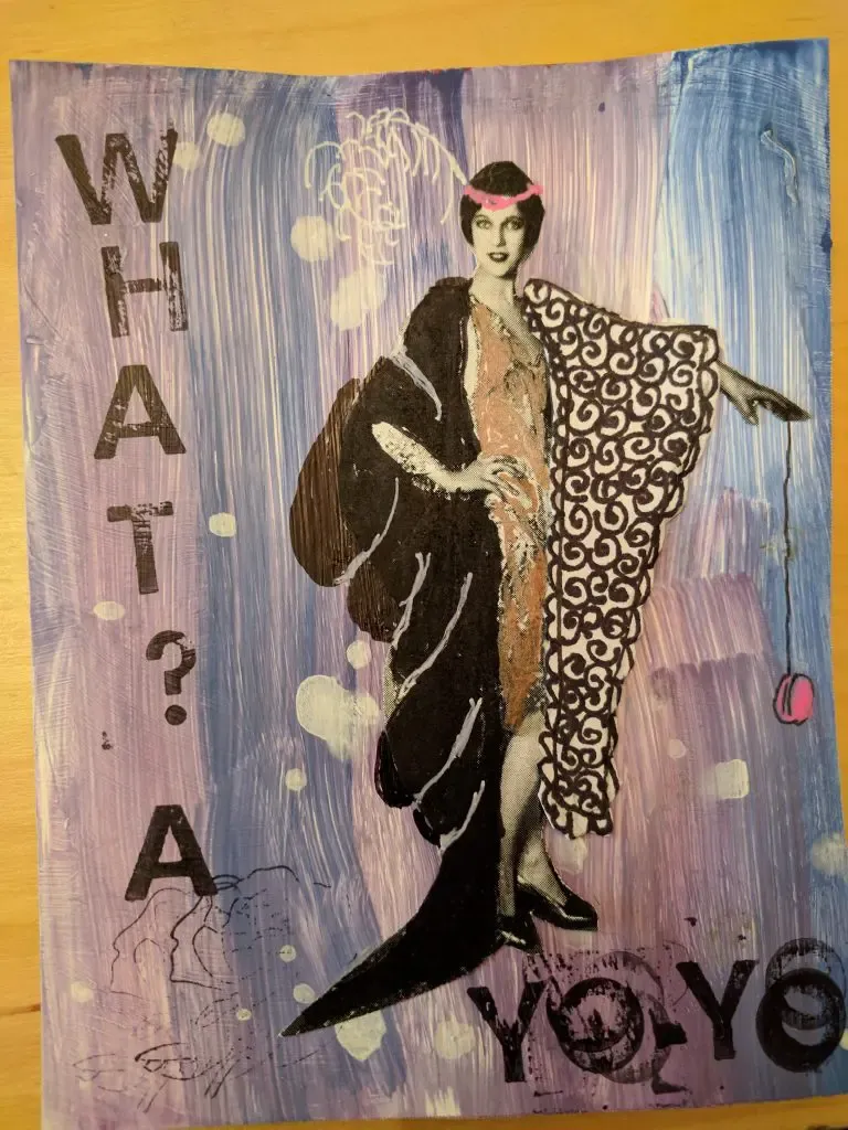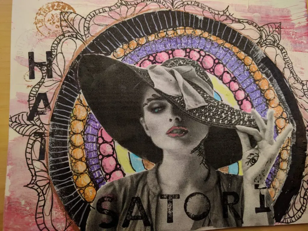 In 2017-18 I began to work with Tangle Art and was also continuing on with my mail art. I began to noodle about with interventions on vintage fashion photos and out of that came a series of postcards that I called “Paper Dolls”. I either made new clothes for the “dolls” or I augmented their surroundings. I think the absurdity of the poses was a large motivator to me, as a feminist. But the approach was light-hearted for the most part.