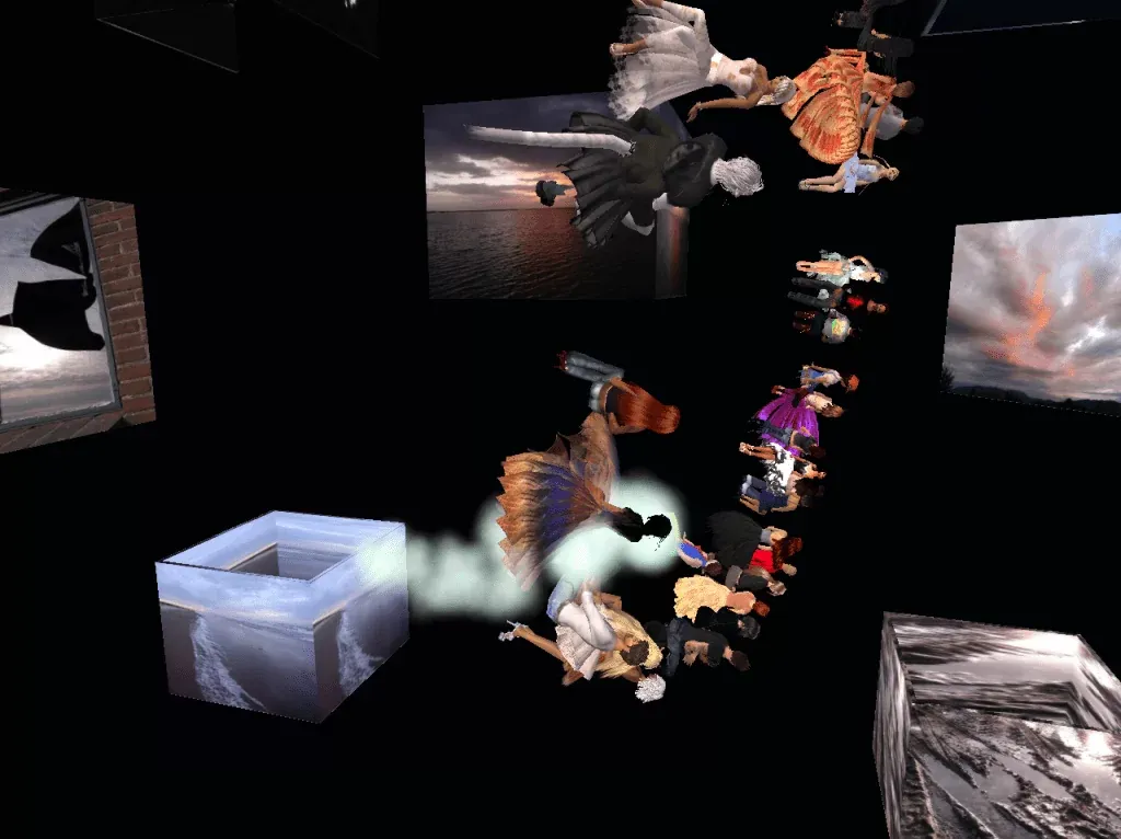 A total of 36 avatars sat around the rim of virtual teacups to whirl through a multimedia art display for a 30 minute trip that ended in a final movement on the ground. The work was composed by Christine Montgomery and accompanied photography by R0bin Helsinki.