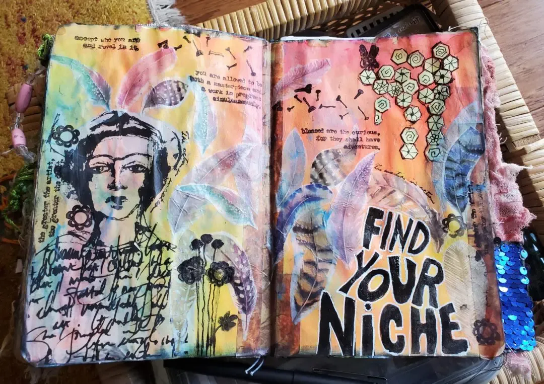 The task this week was to turn around a page you had started and abandoned. Although a lot of art journallers recommend using up paint randomly on pages, personally, I like to be more deliberate. But in working intuitively with the elements already on the page, in the end I was able to “find my niche”.